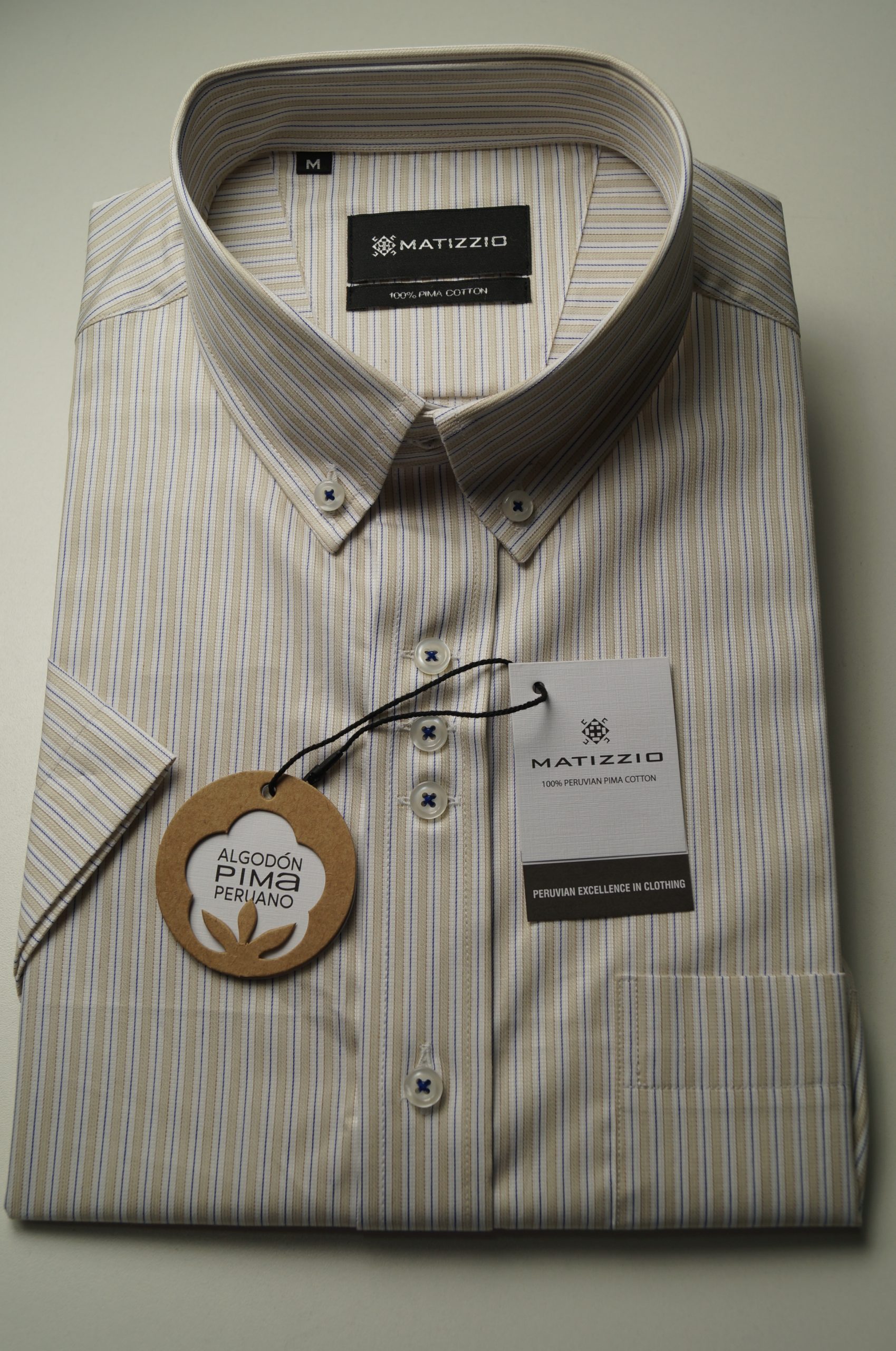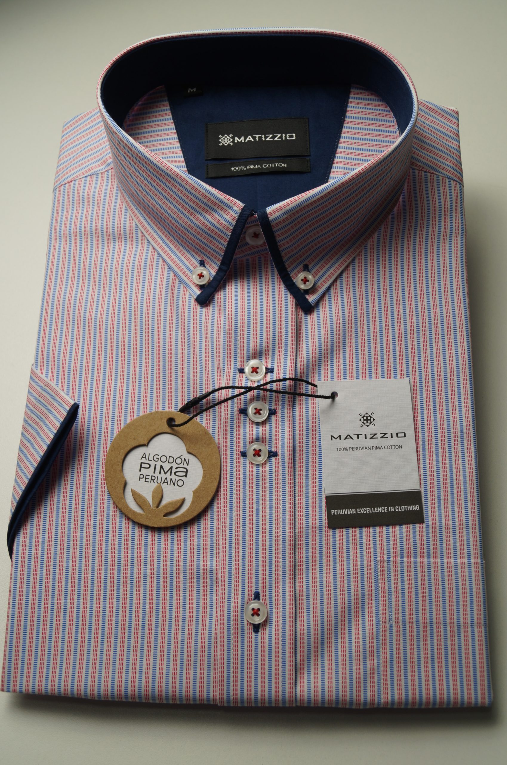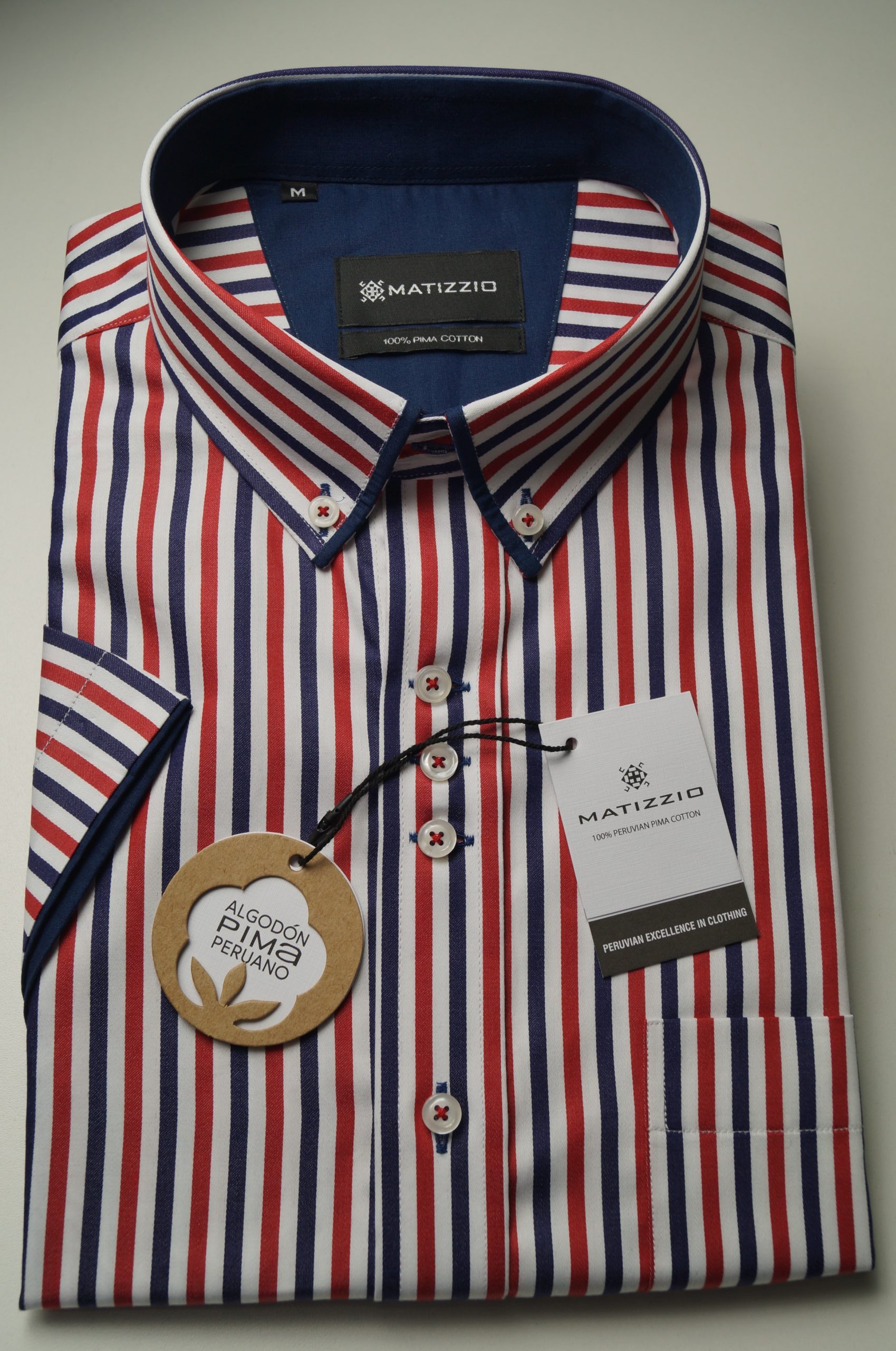 Camisa Matizzio, camisa blanca con rayas azules y moradas, Manga Corta 102