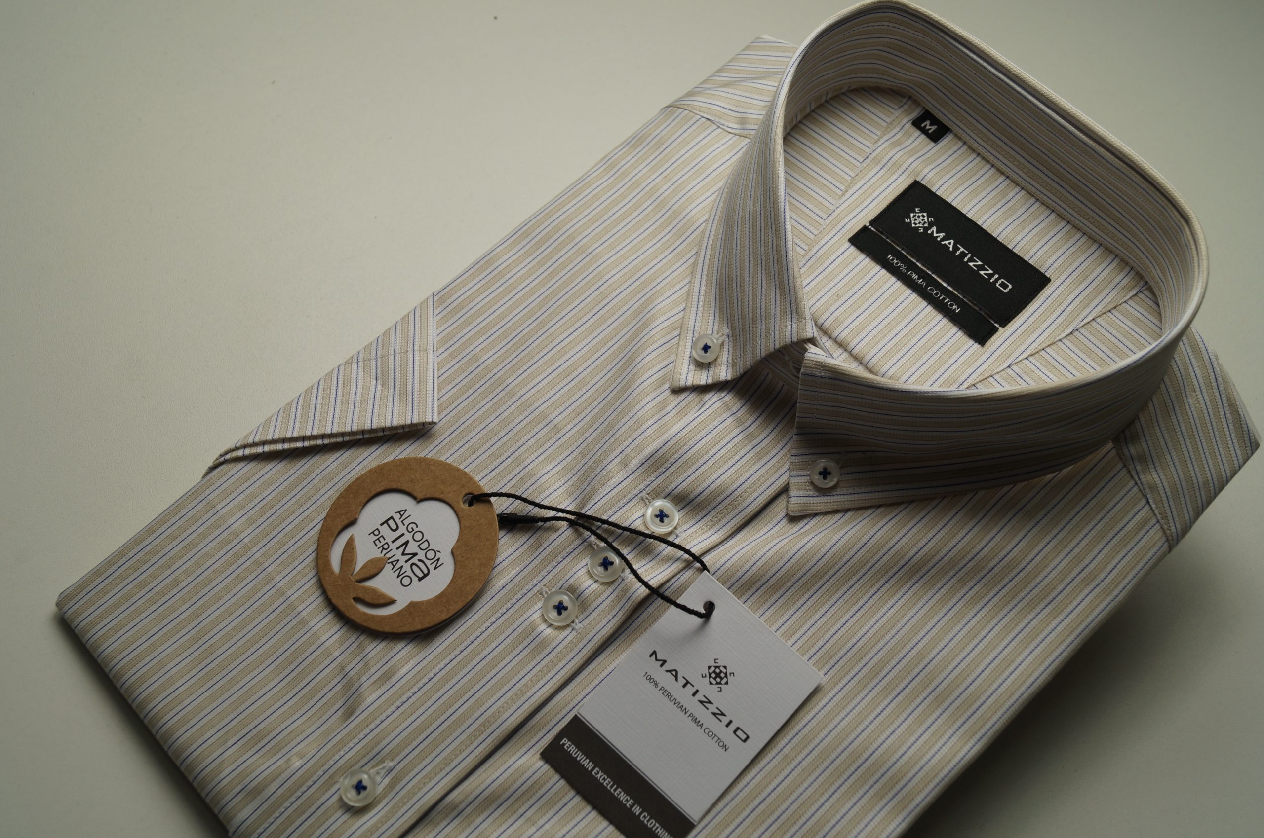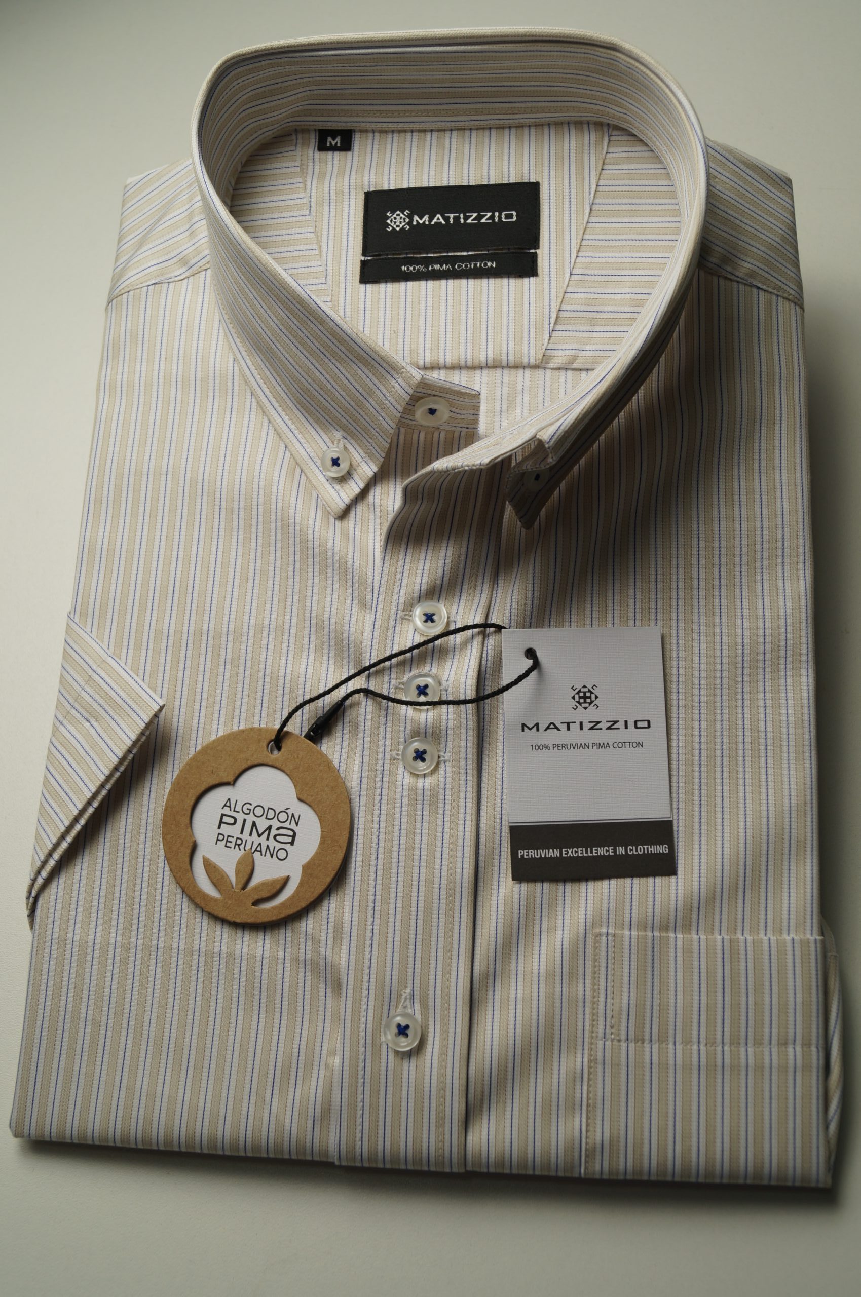 Camisa Matizzio, camisa blanca líneas beig y celeste Manga Corta 112